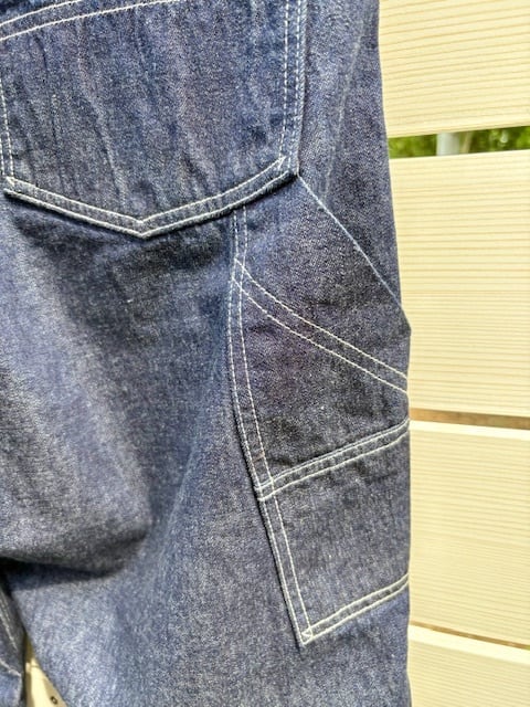 これは、若かりし頃さんさん自分で縫った形。フロントが「持ち出し続き」「見返し続き」という、前端に「裁ちだし」とも呼ばれるパーツがついた状態。ここを、上前側は折ってファスナー付ける。持ち出し(下前)側は裏をつけてファスナー叩く。最初は縫い方がわからないで、ファスナーをどの程度前端から引いてつけるかわからないで、下前のファスナーが見えてしまったり・・・右ボケットもジーンズのコインポケットとは作り方が違い、向こう布をステッチで止めることでポケットを作る。背面はハンマーループ+ツールポケットでこれぞ「ワークパンツ」なデザイン。