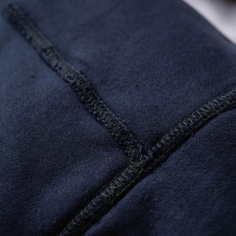 このニューマシーンが僕たちを新しい世界に連れて行ってくれました。縫製の工程としては、さっきのチェーンステッチの上からカバーステッチをかけます。表側は縫い目を跨ぐようにダブルステッチ。裏側はその針の間でジグザグに糸が走ります。これで、生地端をカバーするから、チェーンステッチだけでOKなのか… という気付きがありました。きっとこれは正解です。