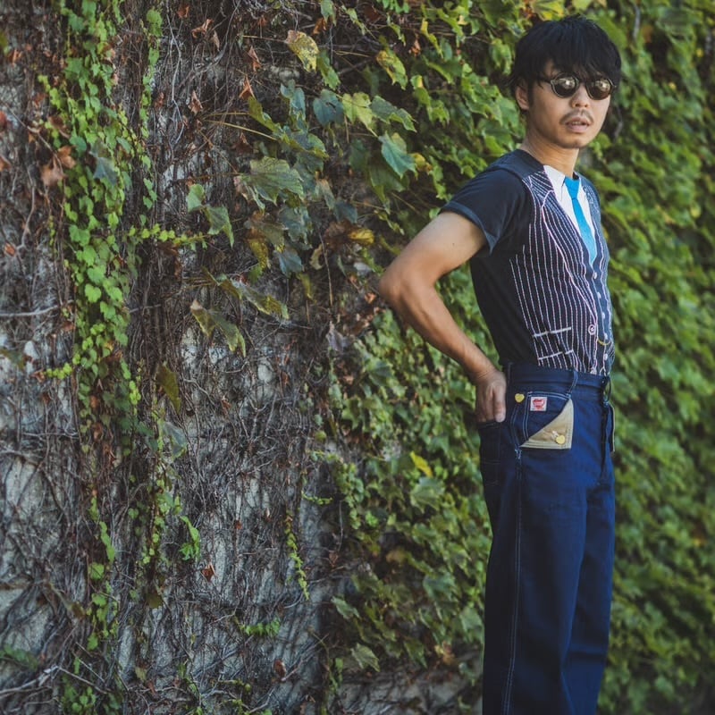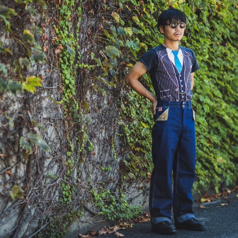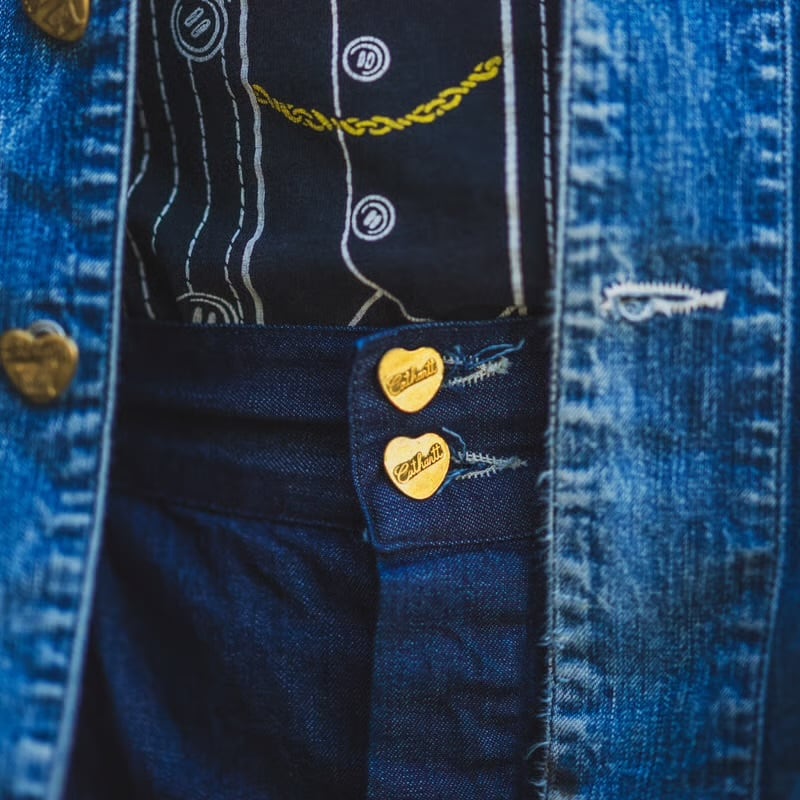 前ポケットがフラップ付きの開閉式なので、ペインターパンツの中でもこのスタイルが一番ハート型のボタンを引き立たせるのではないかと思ったことがきっかけです。もちろん機能的でもあります。別布のチノ素材の部分は補強布としての役割もあり、道具や釘を頻繁に出し入れしても破れにくくする意味があったのかもしれません。さらに、フラップという“蓋”の意味もあり、物の落下防止や引っ掛かりを避ける意図もあったのだと思います。こうしたワークウェアの機能美が、現在ではデザインとして昇華されるのが魅力ですよね。