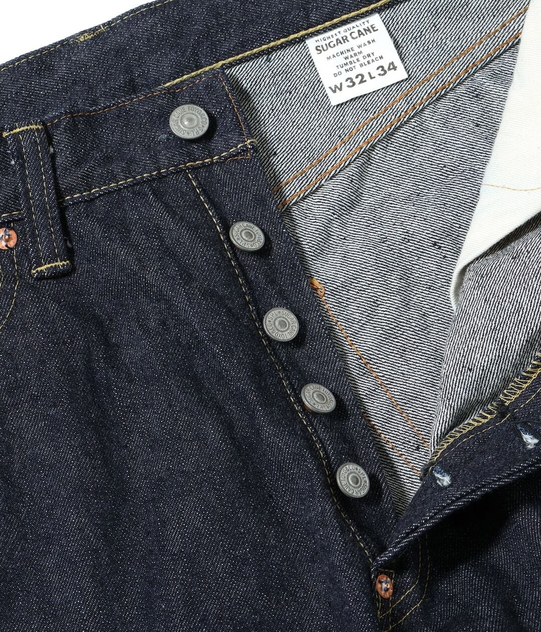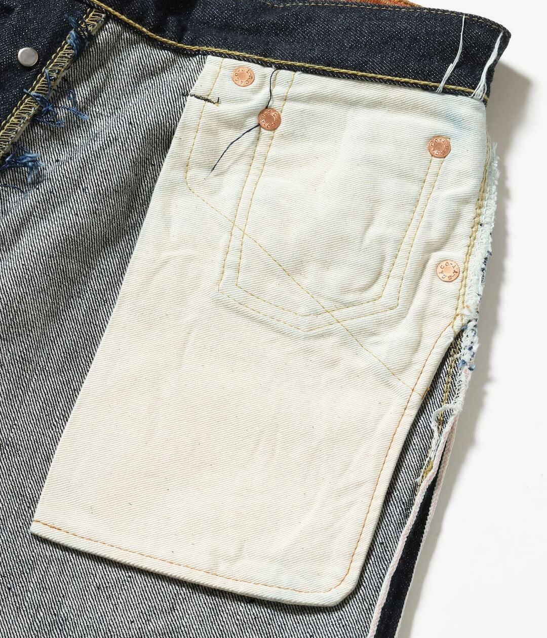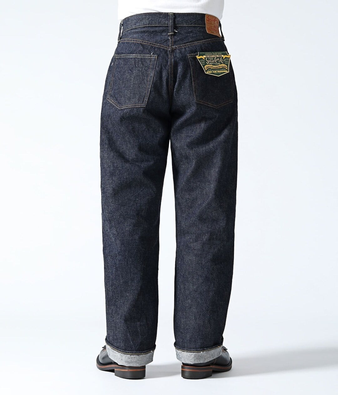 1936年モデルのデニムブラウスと同じ時代のウエストオーバーオールズをベースに、腿から裾までをワークパンツのように太めにアレンジした「2025年モデル」。当時はウエストにサスペンダー用ボタンやシンチバックが付けられるが、シュガーケーンオリジナルの仕様として本作では排除している。しかし股リベットや後中心の巻き縫いの方向(右高)は戦前モデルの仕様を踏襲。生地は前項のデニムブラウス同様に未熟な紡績のムラ糸を再現しており、荒々しい色落ちやエイジングに期待できる。このモデルには新たに製作したグリーンのフラッシャーが付けられる。